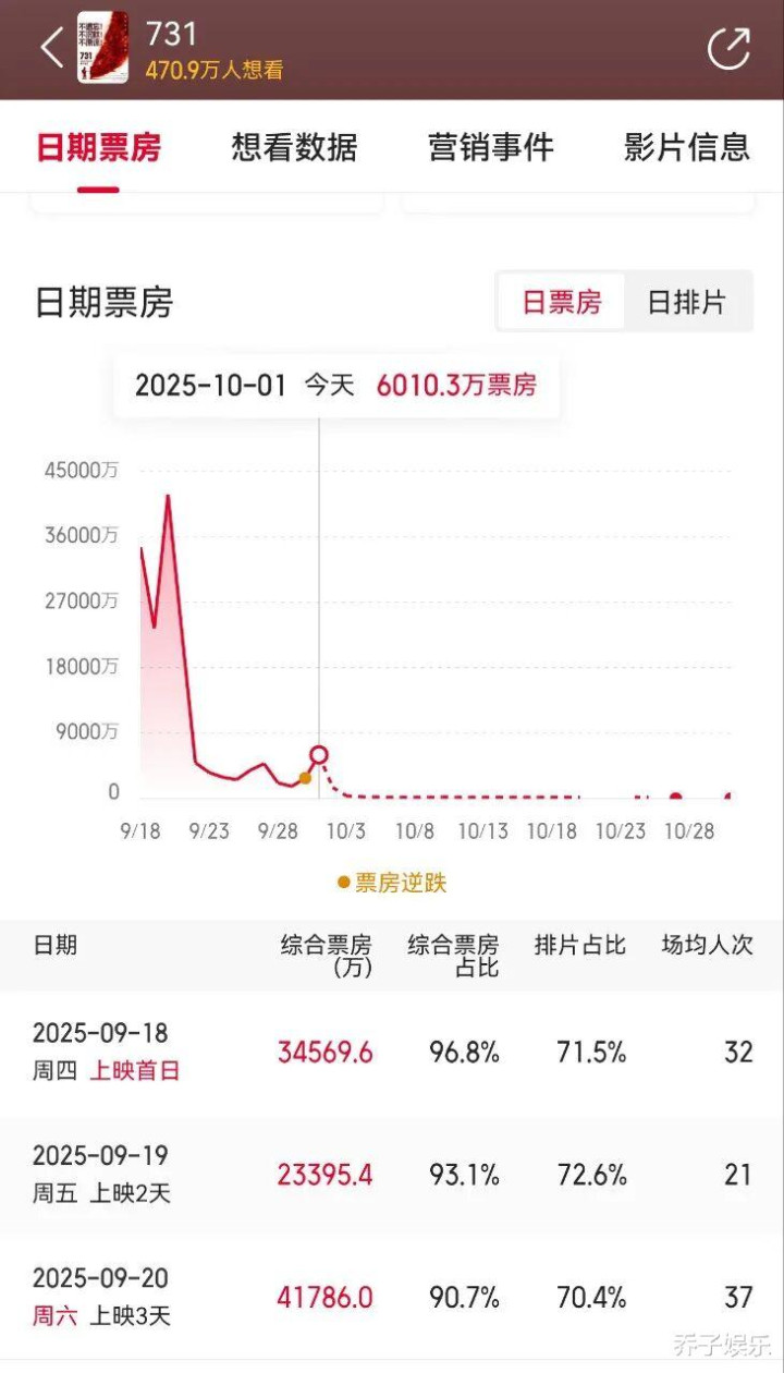 受新片排片影响,《731》的排片都快跌破10%了,可票房表现却是最佳的,上座率断层第一,票房占比等各项数据非常漂亮。